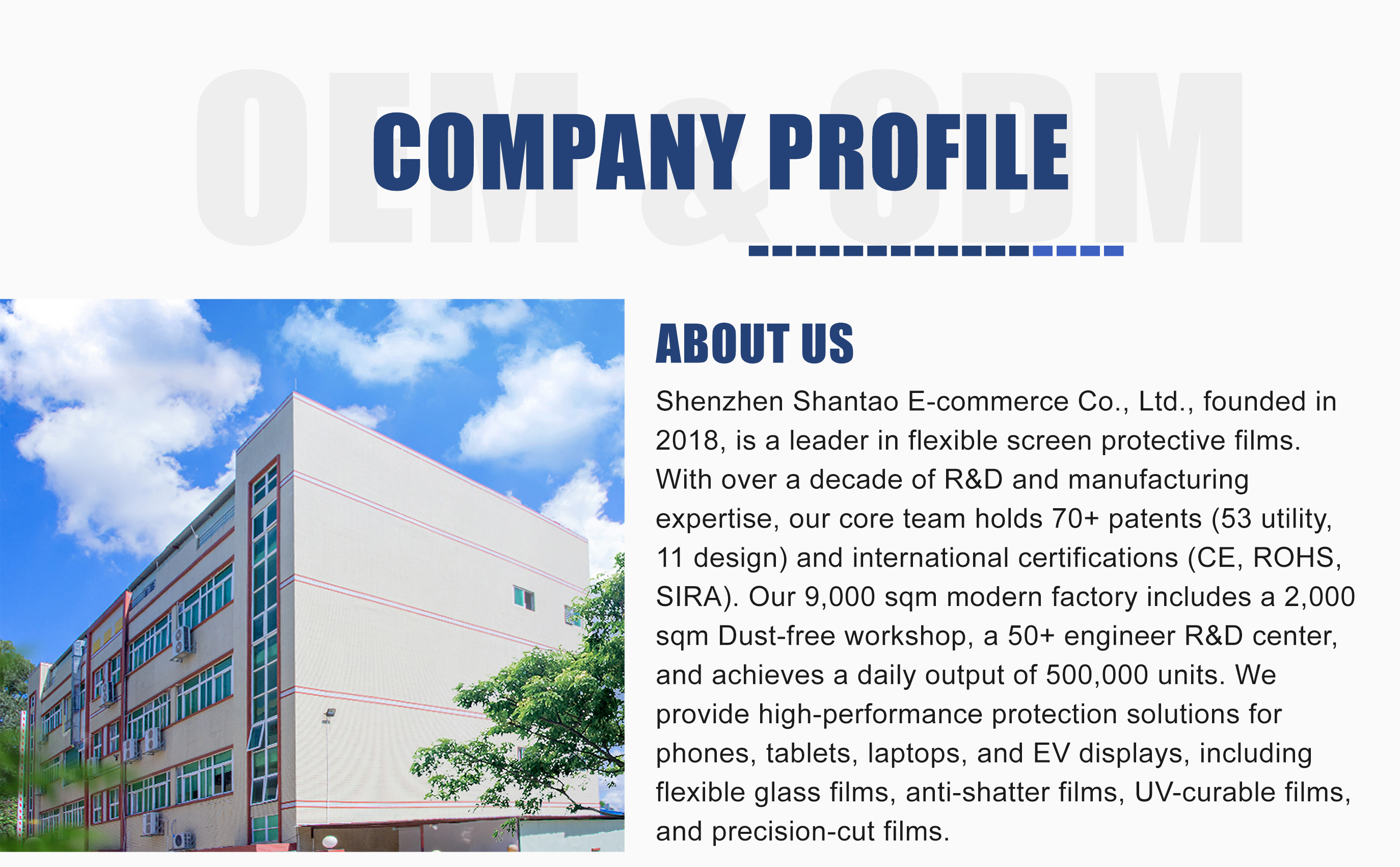 Shenzhen Shantao E-Commerce Co., Ltd. Productos principales:Máquina de corte de piel de teléfono móvil, máquina de fabricación de película de hidrogel, máquina de fabricación de protector de pantalla móvil, película de hidrogel Tpu, película de protección de pantalla